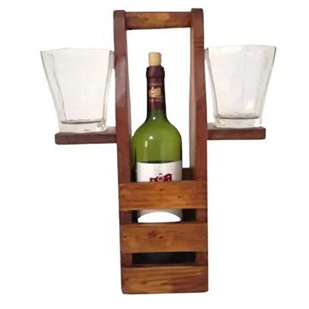 Porta vino portatil playero, con espacio para la botella (Vino, Wiskys, cerveza) y dos vasos o copas; es ligero, de facil limpieza, preparado para la humuedad o climas secos, fabricado en madera.